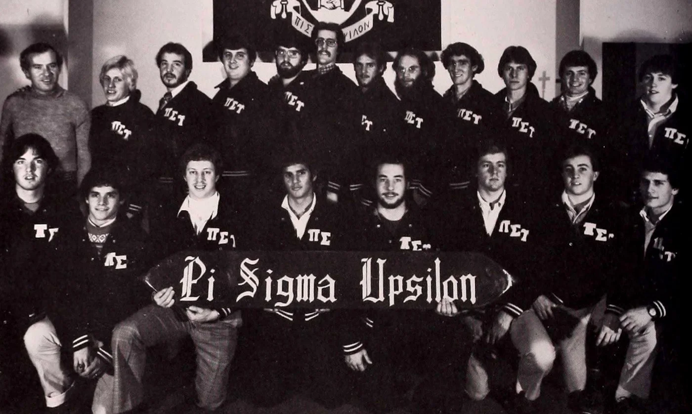 Chris Bird, ~1980, top row, fifth from right, Fitchburg State yearbook photo, Sigma Upsilon Fraternity